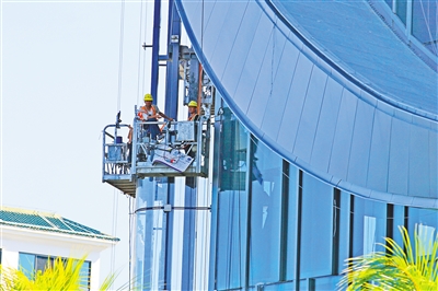 10月1日,三亚湾畔,三亚中央商务区重点建设项目合联中央商务区项目,工人坚守工作岗位,加快主副楼外墙装修。该项目占地面积约49.43亩,总建筑面积16.87万平方米,分办公塔楼、商业裙楼两部分,项目已进入全面精装修阶段。海南日报特约记者 孙清 摄