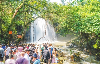 10月4日,在临高县皇桐镇居仁村的古银瀑布景区,游人如织。海南日报全媒体记者 陈元才 摄