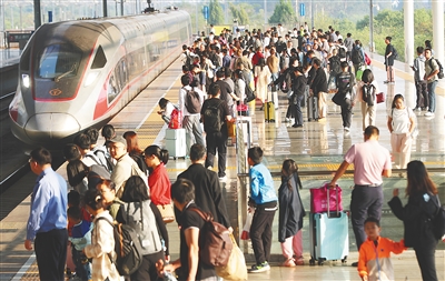10月6日,全国铁路迎来国庆假期返程潮,铁路客流持续保持高位运行。火爆出行的背后是跑出“加速度”的中国铁路:国庆前夕,中国铁路营业里程突破16万公里,其中高铁营业里程超4.6万公里,稳居世界第一。