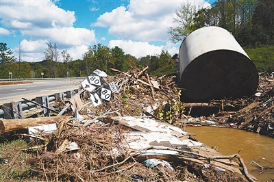 图为10月5日,在美国北卡罗来纳州伯恩斯维尔,飓风过后的公路旁一片狼藉。新华社/法新