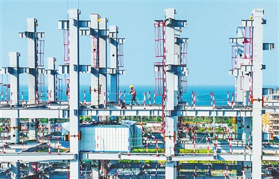 近日,航拍位于海口江东新区总部经济区(生态CBD)的江东智慧国际公寓A区项目,工人正紧锣密鼓地推动主体结构“向上生长”。该项目拟新建地块内的租赁住宅、配套商业、公共设施建筑物以及配套设施,预计今年年底实现主体结构封顶,建成后将为江东新区提供优质、丰富、多元、便利的工作及生活配套服务。海南日报全媒体记者 张茂 摄