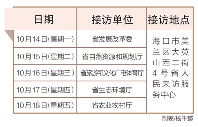 10月14日至18日,省发展改革委、省自然资源和规划厅、省旅游和文化广电体育厅、省生态环境厅、省农业农村厅相关负责人将在海口市美兰区大英山西二街4号省人民来访服务中心接访群众。