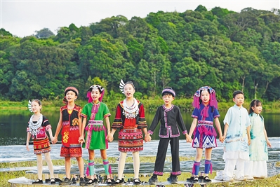 海南雨林自然音乐汇在位于陵水黎族自治县的海南热带雨林国家公园吊罗山片区举行。图为童声合唱主题曲《家乡的歌》。