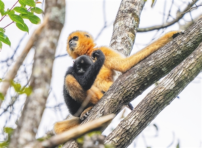 在海南热带雨林国家公园霸王岭片区,海南长臂猿带着幼崽觅食。
