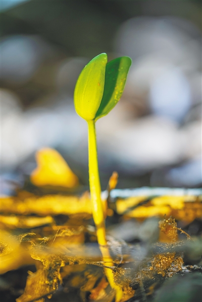 海南热带雨林国家公园黎母山片区,植物的种子正在发芽。