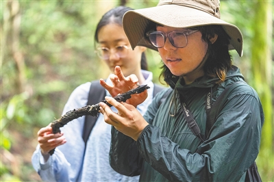 在海南热带雨林国家公园五指山片区,中国热带农业科学院热带生物技术研究所的研究生仔细寻找藏在角落里的大型真菌,为海南热带雨林大型真菌资源保护与可持续利用提供基础数据支撑。