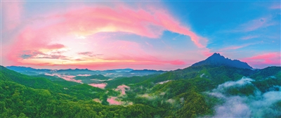 傍晚时分的海南热带雨林国家公园五指山片区,山间云雾缭绕,满天霞光,格外美丽。