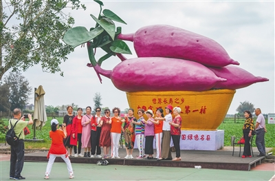 澄迈县桥头镇沙土村,游客在村委会的广场上拍照打卡,购买桥头地瓜。
