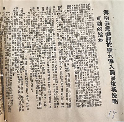 1951年2月20日《海南区党委关于扩大深入开展抗美援朝运动的指示》。资料图
