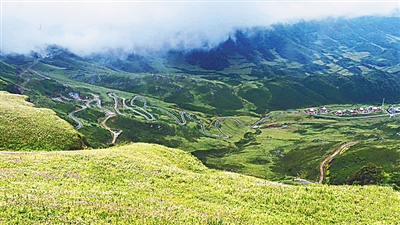 我们选择9月初的一天上午驱车抵达大韭菜坪山脚下。贵州天气阴晴不定。方才消停的一番酥雨润泽着青石板路,凉意袭人。抬头望去,远处山脉连绵似龙踞虎卧,又似一排苍青的屏风迤逦展开。灰白的云雾重重盘旋在半山腰,袅袅渺渺,浑然一幅千里烟波、雾霭沉沉长天阔的壮观画面。