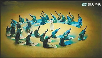 一群盘立高髻、身着青绿汉服的女子,头饰如画中的山石,双袖下垂像是山的纹理,又如山间瀑布,用翩跹的舞姿勾勒出如诗如幻的无垠山河。网友们纷纷称赞它“以雅致清丽的中式美学营造跨越千年的梦境,激活了观众心里的传统文化基因”。