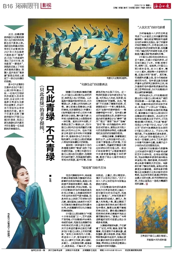 ■ 张艳近日,由爆款舞蹈诗剧《只此青绿》原班人马打造的同名电影在各大影院上映。周莉亚和韩真共同执导的《只此青绿》自2021年8月在国家大剧院首次“展卷”后,已在70余座城市演出了近600场,场场都是“一票难求”,其选段还登上了央视虎年春晚的舞台,领舞人孟庆旸的“青绿腰”更是在网络上掀起了一阵讨论和模仿的浪潮。
