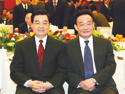 二〇〇五年一月一日,全国政协在北京举行新年茶话会。这是胡锦涛同志与吴邦国同志在一起。