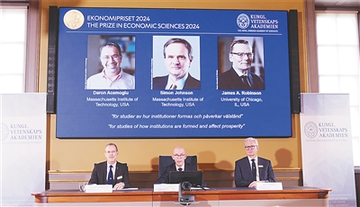 新华社斯德哥尔摩10月14日电 (记者张玉亮 陈静)瑞典皇家科学院14日在斯德哥尔摩宣布,将2024年诺贝尔经济学奖授予三位来自美国大学的经济学家达龙·阿杰姆奥卢、西蒙·约翰逊和詹姆斯·鲁滨逊,以表彰他们在关于制度如何形成并影响经济繁荣研究领域的突出贡献。