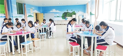 在定安中学心理健康教育研究中心的走廊上,记者看到两侧墙面上张贴着许多不同类型的学生画作,有些是涂色作品,有些是以某一主题创作的画作。这些都是洪符茜和该校其他心理教师在心理课堂上或开展社团活动时带领学生创作的。