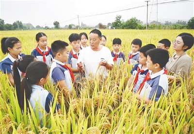 图为浙江省武义县三角店小学学生在壶山街道三角店村稻田里听农民讲水稻种植过程。