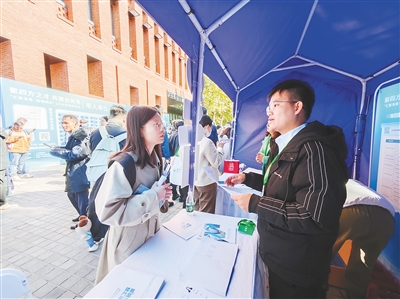 10月19日,“汇聚海南·四城同办”秋季校招活动(北京站)现场,海口招聘团参会企业工作人员与求职者交流。(海口招聘团供图)