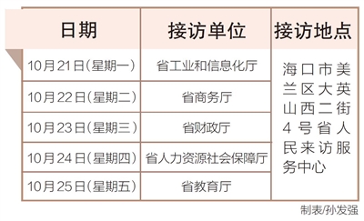 10月21日至25日,省工业和信息化厅、省商务厅、省财政厅、省人力资源社会保障厅、省教育厅相关负责人将在海口市美兰区大英山西二街4号省人民来访服务中心接访群众。
