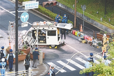 10月19日,在日本东京,警察在冲撞首相官邸的车辆旁工作。新华社/法新