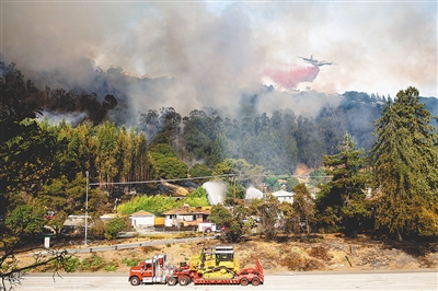 图为一架飞机在美国加利福尼亚州奥克兰市进行灭火作业。新华社/美联