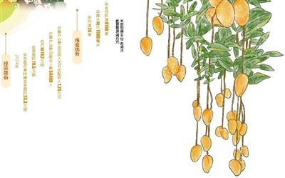 统计数据显示,目前乐东芒果种植面积23.3万亩,收获面积19.5万亩,年总产量19.2万吨。芒果产业带动就业人数5.8万多人,芒果产业带动种植户年人均可支配收入1.23万元。