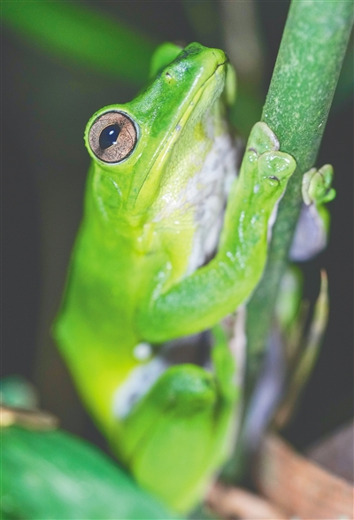 而在雨林的暗处,还潜藏着一些狡猾的杀手。海南尖喙蛇是海南特有种,作为树栖蛇,它凭借通体绿色的伪装手段,藏匿于树上,以蛙类等小型动物为食。它潜伏在猎物附近,如同一位隐身的刺客,耐心地等待最佳出击时机。