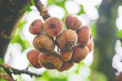 更为奇特的是,为了吸引林下空间的昆虫传粉,海南热带雨林中的一些植物在演化过程中降低了花果的位置。“老茎生花”是一些热带雨林树木的特性,即植物的花朵和果实都生长在树干上,而非高不可及的树枝上。这种特殊巧妙的安排,不仅让植物能够更容易地吸引昆虫传粉,还为昆虫提供了一个相对安全的觅食场所。