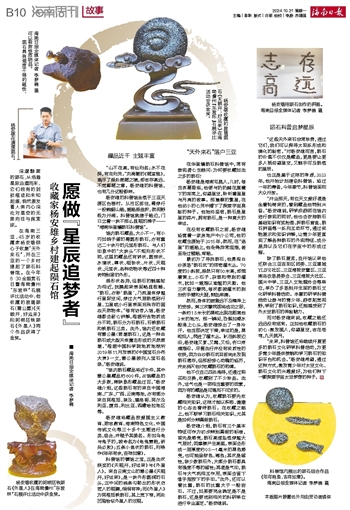 杨安雄是海南屯昌人,儿时,每当夜幕降临,他便与奶奶躺在屋檐下的凉席上,仰望星空,聆听着星星与月亮的故事。那璀璨的繁星,在他幼小的心灵中播下了探索宇宙奥秘的种子。他始终坚信,陨石是星星的碎片,拥有陨石,是一种莫大的幸运。