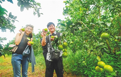 10月19日,澄迈举行福橙品牌推介活动。图为游客在福橙采摘园体验采摘。