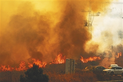10月20日,以色列北部的罗什皮纳遭受黎巴嫩真主党火箭弹袭击后燃起大火。新华社发
