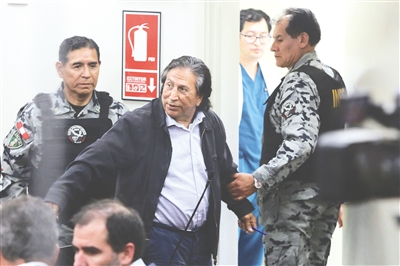 10月21日,在秘鲁首都利马,法警护送前总统亚历杭德罗·托莱多(中)离开庭审现场。