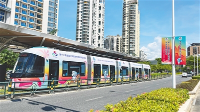 日前,车身绘有运动会吉祥物“吉贝”卡通形象的轨道交通车辆穿梭在三亚市街头,引人注目。 通讯员 黄东光 摄
