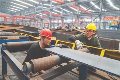 近日,在位于临高金牌港开发区的海南昊城钢结构工程有限公司生产车间,工人全力以赴地抓紧生产。海南日报全媒体记者 袁琛 摄