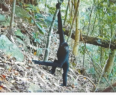 中国林科院研究团队监测拍摄到海南长臂猿有下地行为。中国林科院供图。