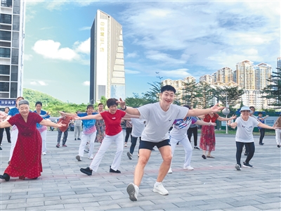 ■ 海南日报全媒体记者 刘杰“一二三,左脚点地!”“四五六,右脚抬起!”近日,在三亚市吉阳区月川社区老年人日间照料中心前的广场上,一群老年人伴着优美的音乐,跟随着“80”后小伙刘小麒的口令,欢快地跳起了广场舞。