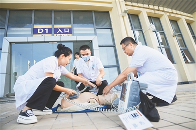 ③珍珠球比赛全要素协同演练中,医疗急救组就运动员受伤情况进行演练。