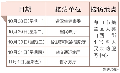 10月28日至11月1日,省卫生健康委、省民政厅、省住房和城乡建设厅、省交通运输厅、省水务厅相关负责人将在海口市美兰区大英山西二街4号省人民来访服务中心接访群众。