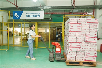 10月25日,在海口市跨境电商产业孵化园跨境公共云仓,工作人员在搬运货物发往国外。