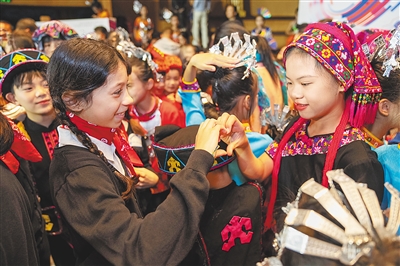 夜色渐起,一场持续2个小时的音乐会在竹竿舞中落下帷幕。散场时,五指山黎苗童声合唱团的苗族成员杨姝垚拿着一盒自家做的苗族三色饭跑到舞台,塞到了法国小朋友的手里,她们互道再见,期待明天的携手同行。