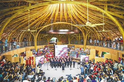 五指山黎苗童声合唱团的成员们亦用《把五指山唱给法兰西》《雨林时光》《久久不见久久见》等曲目,与宝丽声童声合唱团进行友好互动。