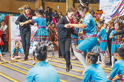 巴黎宝丽声童声合唱团成员体验竹竿舞。