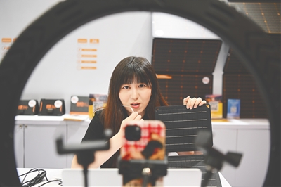 工作人员在广交会现场直播介绍便携式太阳能光伏板。