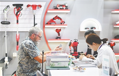 境外采购商(左)在第136届广交会上的一处电动工具展台洽谈。