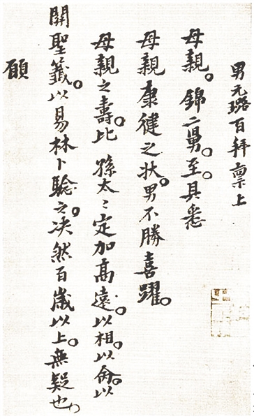 倪元璐的《家书》,则展现了他的另一面。这封信是倪元璐写给母亲的,书写格式非常讲究礼仪规范:他在母亲面前自称“男”,出现“母亲”二字时,皆提行另起,其他行起字皆低了一个字左右。从字体上看,此信全篇用小楷字体书写,字迹清晰可辨,墨色自然,取势平整。而倪元璐的传世信札以行草书体为主,楷书信札极少。同时,此信的每句话都标有句读符号,以方便阅读,十分贴心。看倪元璐的《家书》,可以看到他对母亲的恭敬、孝顺,以及他性格中细心、体贴、温暖的一面。用现在的话说,他是个“暖男”。