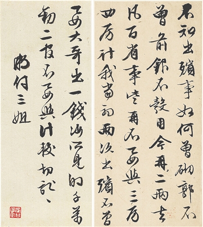 作为明代“吴门书派”的领袖,文徵明才华横溢,诗书画印无一不通,《明史》称“徵明主风雅数十年”。他一生创作了大量书法作品,存世的信札也很多。其中有一封他写给妻子的《致妻札》颇为有趣,被后人称为“唠叨书”。性格拘谨、硬脾气的文徵明,在信中展现了他的另一面:细腻、温情、优雅。《致妻札》的行文率性随意,唠唠叨叨,却给人一种温暖的感觉。在信中,他对妻子絮叨着家长里短,询问家中近况和银钱是否够用等琐事,嘱咐妻子不要与大哥计较,说完还不忘写上:切记、切记。从这封家书中,我们似乎看到了一个爱操心、爱唠叨的文徵明。信中提到的“三姐”,是文徵明对妻子的称谓,这种平实、随性的称谓,也颠覆了我们对他严肃拘谨、一丝不苟性格的固有认知。