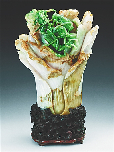 现存的翡翠质地文物大都是清代至民国时期的,最知名的当数作为台北故宫博物院“镇院三宝”之一的翠玉白菜。此件文物原为清宫旧藏,据说曾陈设于永和宫,是清光绪帝妃子瑾妃的嫁妆,后辗转至台湾省收藏。翠玉白菜确实形似一棵白菜,其菜身洁白,菜叶翠绿,在青翠的菜叶之上,还趴伏有螽斯(蝈蝈)和蝗虫,巧妙的俏雕极其逼真生动。白菜谐音“百财”,在古代有招财的寓意。螽斯和蝗虫繁殖力很强,所以此件文物又包含着子孙繁盛的希冀。