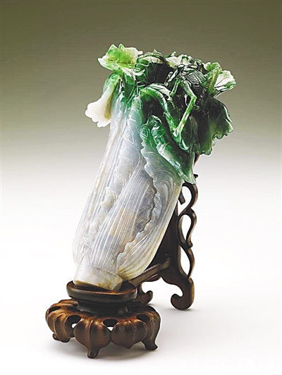 另外,天津博物馆的清代翡翠蝈蝈白菜也小有名气,这件翡翠白菜除却翠、白二色,还多了灰黄,工匠独具匠心地将灰黄色部分俏雕,此处像是白菜经历过寒冬之后的冻伤痕迹,故而这棵翡翠白菜有个“冻白菜”的绰号。另外,菜叶之上雕刻有两只蝈蝈和一只螳螂,三只虫子像是边爬行边啃食菜叶,画面的营造可谓栩栩如生。