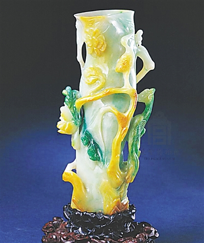 翡翠之名的由来有两种说法:一说当年翡翠被引进中国时,国内主要的玉石品类是新疆出产的和田碧玉(亦称翠玉),当缅甸翡翠流入云南等地后,人们分辨出这种玉石与和田碧玉明显不同,故将之称为“非翠”,意为不是中国的翠玉,后来又演变为“翡翠”。另一说翡翠之名源自鸟名,唐代陈子昂曾在《感遇》一诗中写道:“翡翠巢南海,雄雌珠树林。”据说,中国南方有一种鸟,毛色极为艳丽,雄鸟羽毛呈红色,名为“翡鸟”;雌鸟羽毛呈绿色,名为“翠鸟”,合在一起被称为“翡翠鸟”。翡翠(玉石)的颜色宛如赤色羽毛的翡鸟和绿色羽毛的翠鸟,因此得名。目前在翡翠市场上,确实有“翡为公,翠为母”的说法,“红翡绿翠”之说由此而来。比如,故宫博物院收藏的清代翠雕花鸟纹花插,便同时具有翡、翠二色,翠呈青绿色,局部又有深绿及黄褐色,属于清代宫廷中比较珍贵的陈设器。