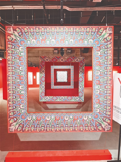 藻井装置打卡点,将这一“天空的艺术”搬到观者中间,人们得以穿梭其中,在观赏多种繁复图案的层次和节奏变化中,感受藻井所带来的生动活泼,朝气蓬勃。