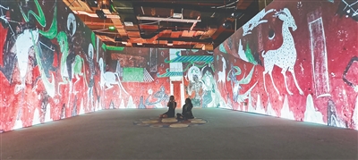 大漠驼铃熙熙攘攘,飞天伴着敦煌乐声轻盈起舞,色彩绚丽的藻井变化移动,灵动发光的九色鹿闯入梦幻森林……千年历史与敦煌艺术,被凝缩于展厅,在我们眼前“复活”,仿佛伸手可触。